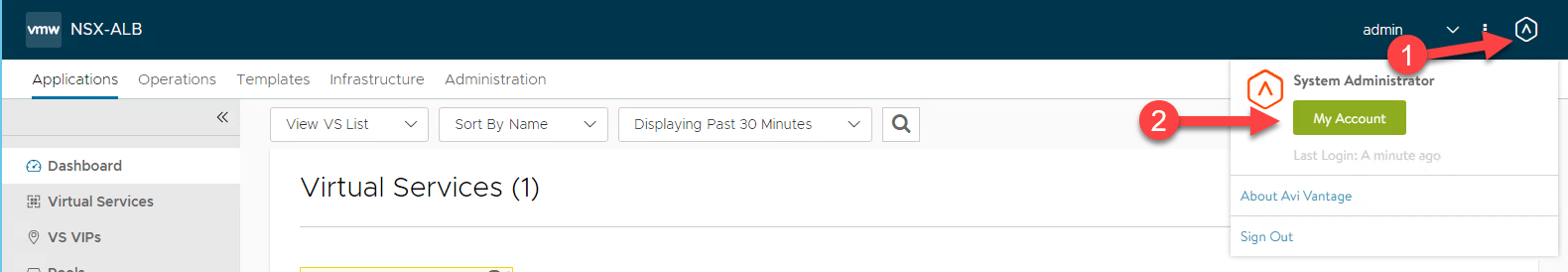 While logged into the Avi controller click on the Avi icon (1) in the upper right corner and select My Account (2).