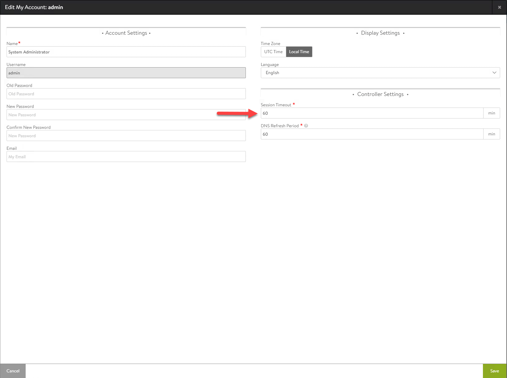 The part that wasn’t clear to me was whether the UI timeout was based on a per-user setting or if it applied to all users of the controller. The configuration is done through the “My Account” section of an admin user with write access. It is set at what appears to be an account level but it actually applies controller-wide for all user accounts. From a security perspective, it makes sense to keep this controlled at a global controller level. Be aware that any System Admin account can adjust this setting and all other System Admins or other users will be held to the Session Timeout setting. I confirmed this by testing with multiple accounts of varying roles, including other System Admin accounts, and the timeout would apply across all accounts. It is a global setting.